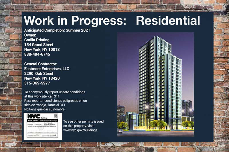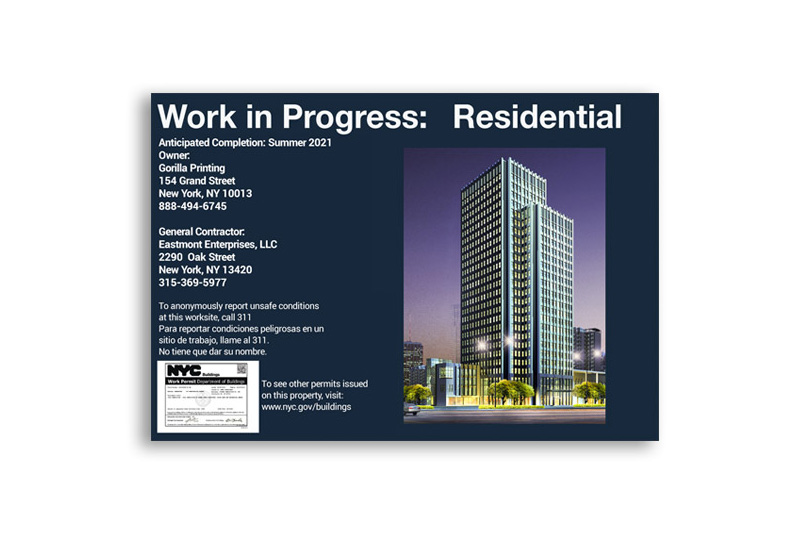 Our Brooklyn DOB-compliant construction fence signs are printed on heavy-duty coroplast, built to withstand tough job site conditions. Available in two standard sizes for properties above or below 60′ frontages, each sign can be customized with your project information, permits, and renderings—ready for fast, professional production.